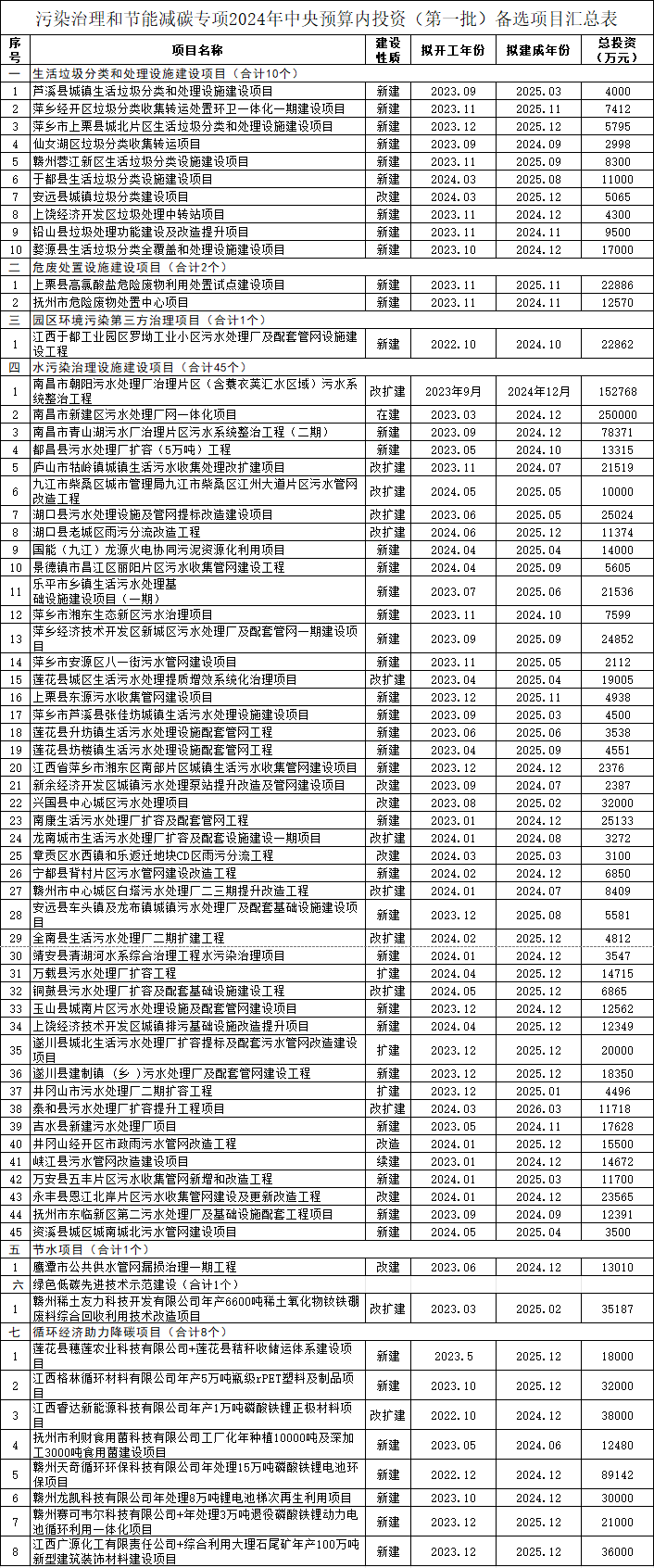 江西省發(fā)展改革委關(guān)于污染治理和節(jié)能減碳專項2024年中央預(yù)算內(nèi)投資(第一批)備選項目的公示,經(jīng)初審、第三方組織專家評審、行業(yè)部門聯(lián)審,擬推薦備選項目68個,包含生活垃圾分類和處理設(shè)施建設(shè)項目(合計10個),危廢處置設(shè)施建設(shè)項目(合計2個),園區(qū)環(huán)境污染第三方治理項目(合計1個),水污染治理設(shè)施建設(shè)項目(合計45個),節(jié)水項目(合計1個),綠色低碳先進(jìn)技術(shù)示范建設(shè)(合計1個),循環(huán)經(jīng)濟助力降碳項目(合計8個)。